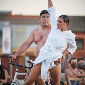 Mentir lo Mínimo est un spectacle qui cherche à se débarrasser de tout ce qui n’est pas nécessaire et parle du voyage de ces trois corps sur la scène : la femme, l’homme et le vélo, et comment ils se débarrassent de leurs propres couches pour arriver à l’essentiel, au minimum.